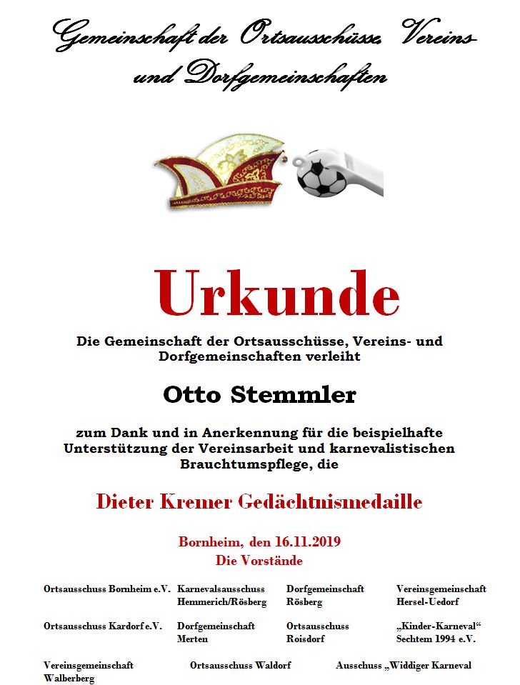 Eine besondere Würdigung gab es an diesem Abend. Für seine besonderen Verdienste um das Brauchtum Karneval wurde Otto Stemmler, 26 Jahre Festwirt der Kolpingsitzung und vieler karnevalistischer Veranstaltungen in Roisdorf, mit der Dieter Kremer Gedächtnismedaille ausgezeichnet.