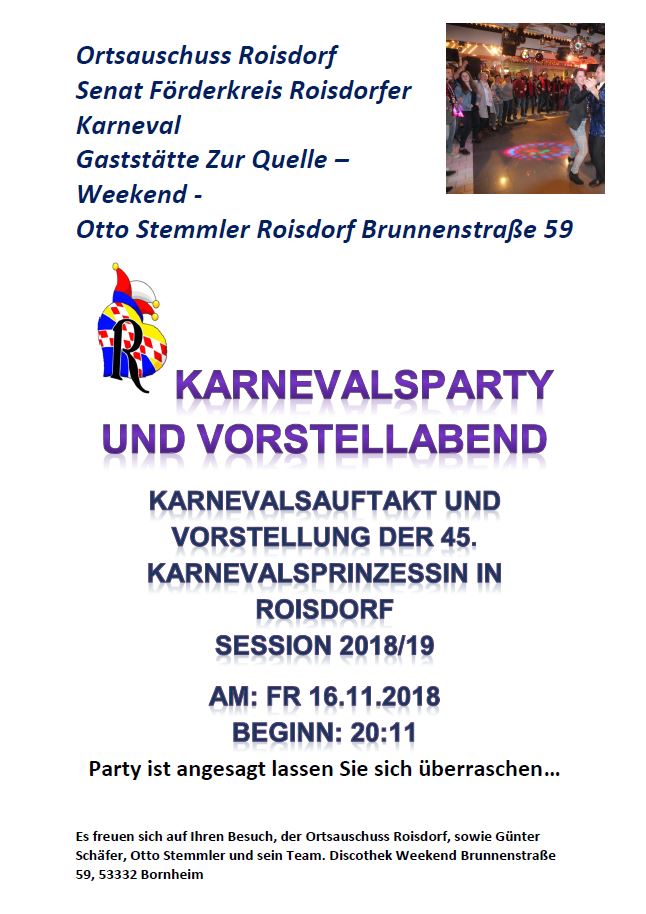 Am 16. November 2018 wurde ich im Rahmen des Roisdorfer Karnevalauftakts in den Räumen der Diskothek Weekend durch unseren Ortsauschussvorsitzenden Wolfgang Mertgen vorgestell.